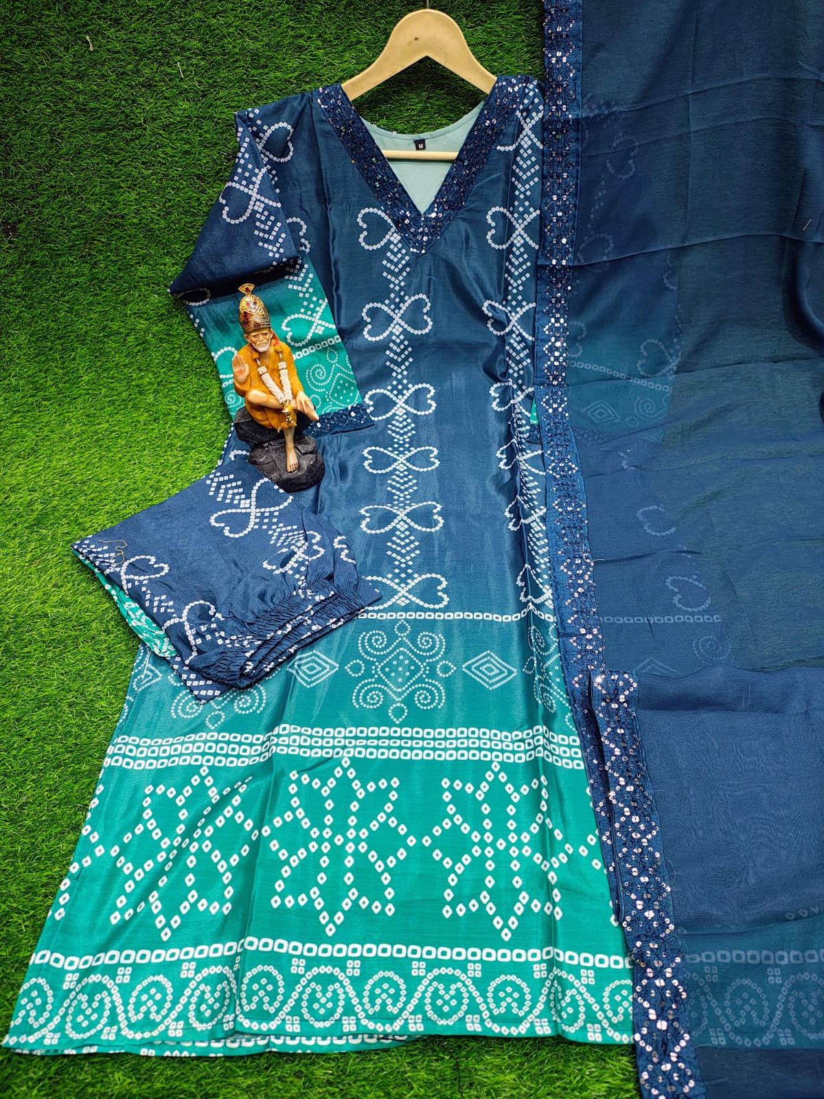 Featuring beautiful Heavy Suit Set which is beautifully decorated with intricate Sequence embroidery work, Zari weaving . It is paired with matching pants and embroidery Dupatta.